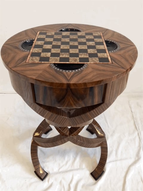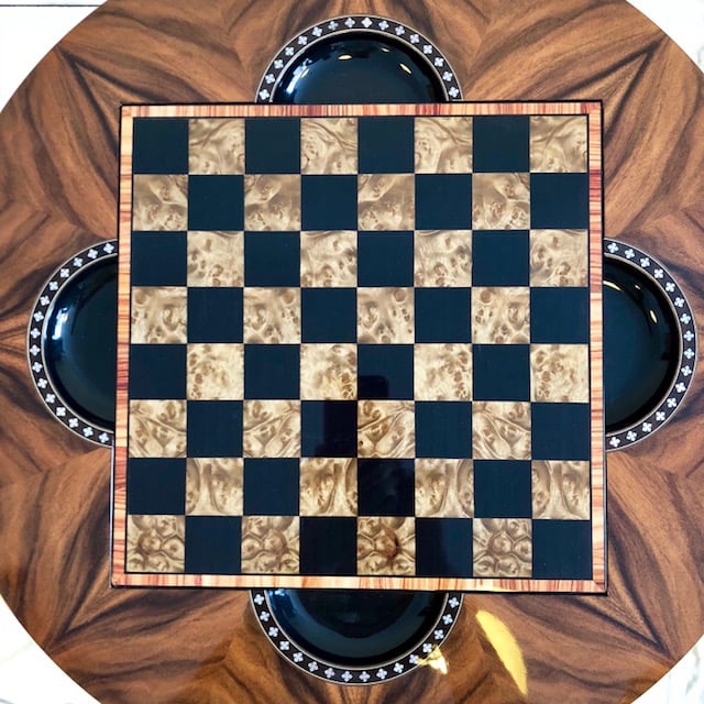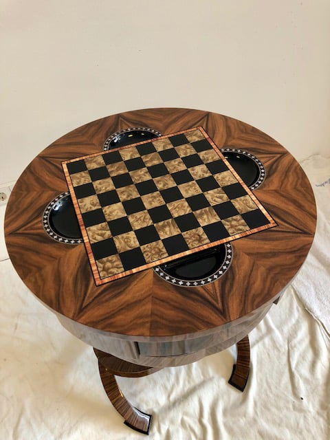 Dieser aufwändige Spieltisch ist in zweimonatiger Arbeit aus Palisander (Tisch) sowie Ebenholz und golden Madrona (Schachbrett) entstanden.